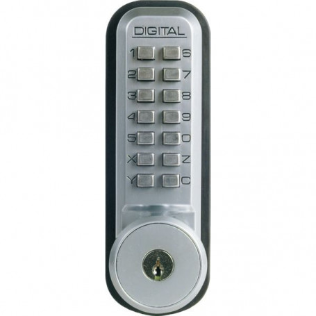 La clé permet l'accès en cas de perte du code et facilite l'entrée des services de sécurité ou d'entretien. Adaptable sur toutes les portes d'épaisseur 35 à 55 mm. Réversible. Installation à l'intérieur ou à l'extérieur. L'accès est contrôlé côté externe et libre côté interne. Face avant ouverture par code de 4 à 6 termes. Face arrière verrou avec pêne dormant en applique. Corps et bouton en zamak, touches en inox. Dimensions : 152 x 51 mm Finition : alu brossé