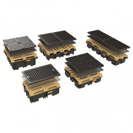 Solution permettant de stocker les fûts sur les palettes dans les zones de déchargement. Bac en polyéthylène, résistant à de nombreux acides et bases. Adapté aux palettes EURO 80 x 120 et 120 x 120. Avec passage de fourche. Bac empilable avec ou sans caillebotis.
