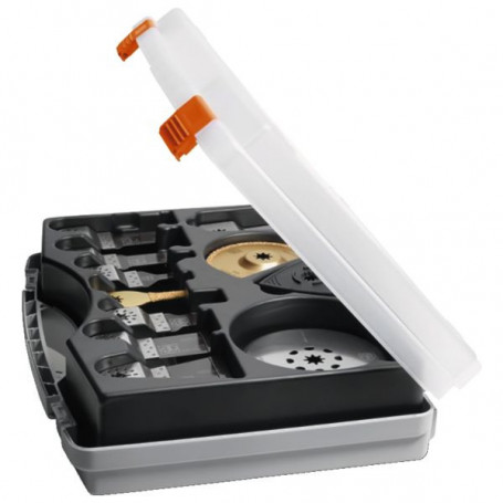 Pour des travaux de rénovation et applications dans le bois et les métiers du bois. 2 x 1 lame E-Cut Universal 32 et 44 mm, 2 x 3 lames E-Cut Long-Life 35 mm et 65 mm, 2 x 1 lame E-Cut Long-Life 10mm et 20 mm, 1 lime carbure, 1 spatule rigide, 1 plateau circulaire 115 mm, 3 x 2 feuilles abrasives grain 60,80,180, 1 patin non performé, 4 x 5 feuilles abrasives grain 60,80,120,180, 1 lame segment à concrétion carbure 90 mm.