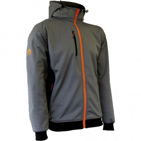 Extérieur : softshell déperlant 96% polyester 4% élasthanne Intérieur : polaire Capuche amovible avec serrage cordon. 3 poches extérieures. Coloris : Gris Taille : S à 3XL Norme : CE Cat II - EN 14058 (1.3.X.X)